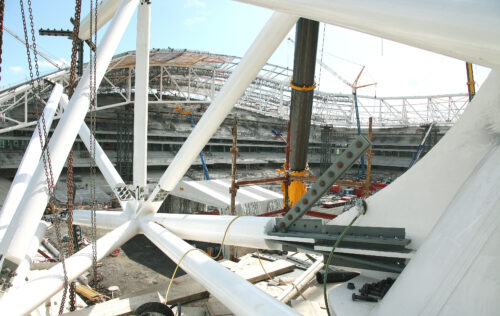 Designed as a horseshoe truss which was intended to be a tubular fully welded structure. The successful contractor (Cimolai) opted instead for a bolted structure where the bolted connections are concealed. Because of the curvilinear shape and varying height the only symmetry is at the North-South access with minimal repetition.